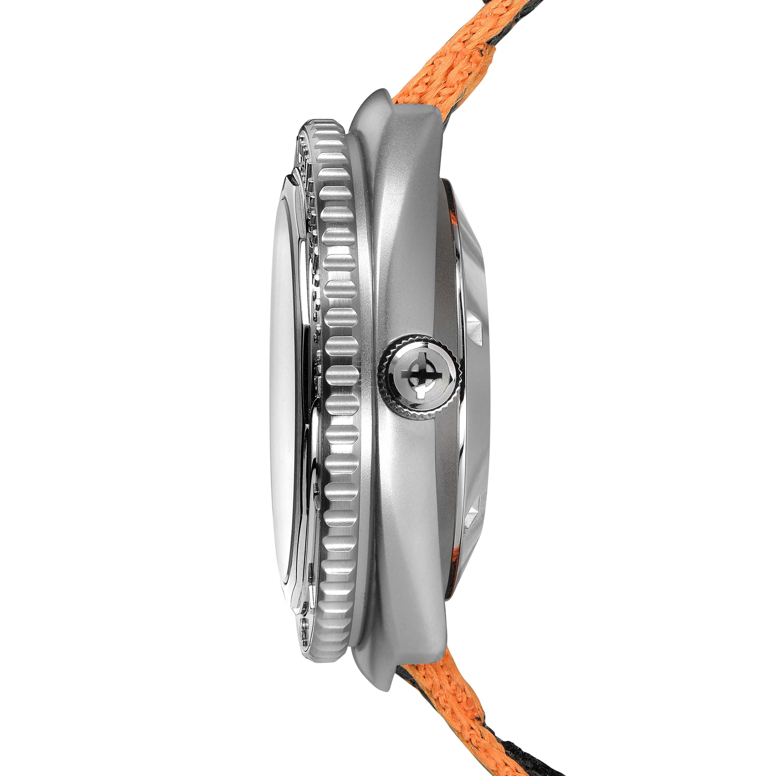 Great color combination in the dial, indexes & the hands of Grey & Orange. This watch comes at a 44MM case, Before you panic! this watch feels perfect on the wrist due to it’s design.